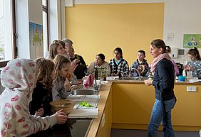 Zunächst erfuhren die Kinder, wofür eine Ringelblumensalbe gut ist (z. B. als Lotion für die Haut oder zur Behandlung kleinerer Wunden). Danach durften sie die Pflanze mit allen Sinnen erleben: Sie betrachteten die leuchtend orangefarbenen Blüten, hielten sie in den Händen, nahmen ihren Geruch war – und manche probierten sogar ein Blütenblatt.
