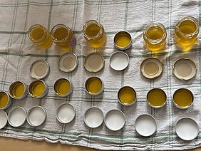 Anschließend ging es ans Selbermachen: Gemeinsam wurden Sheabutter, Kokosöl, Bienenwachs, Ringelblumenöl (das Frau Kaiser bereits vorbereitet hatte) und Vitamin E leicht erhitzt, verrührt und in kleine Gläser gefüllt, bevor die Salbe fest wurde.