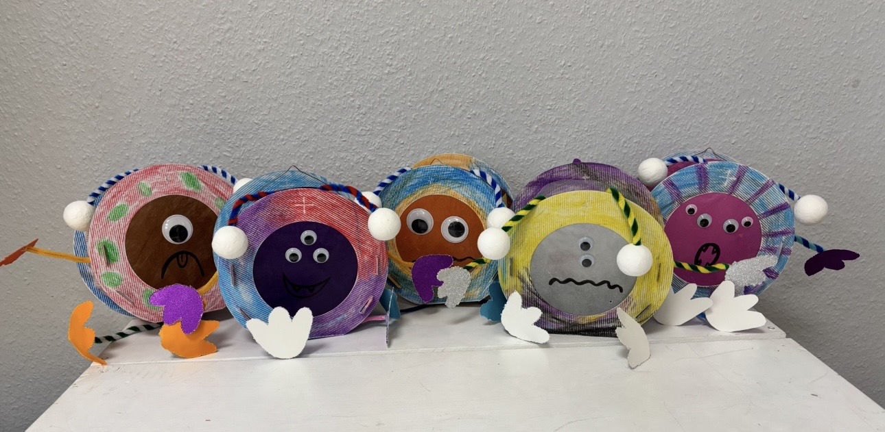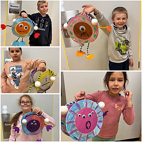 Die fertigen Monster-Laternen werden nun bald bei den St. Martins-Zügen zum Einsatz kommen, und die Kinder können sie stolz präsentieren. Es war ein zauberhaftes Erlebnis für unsere erste Klasse! (Mei)